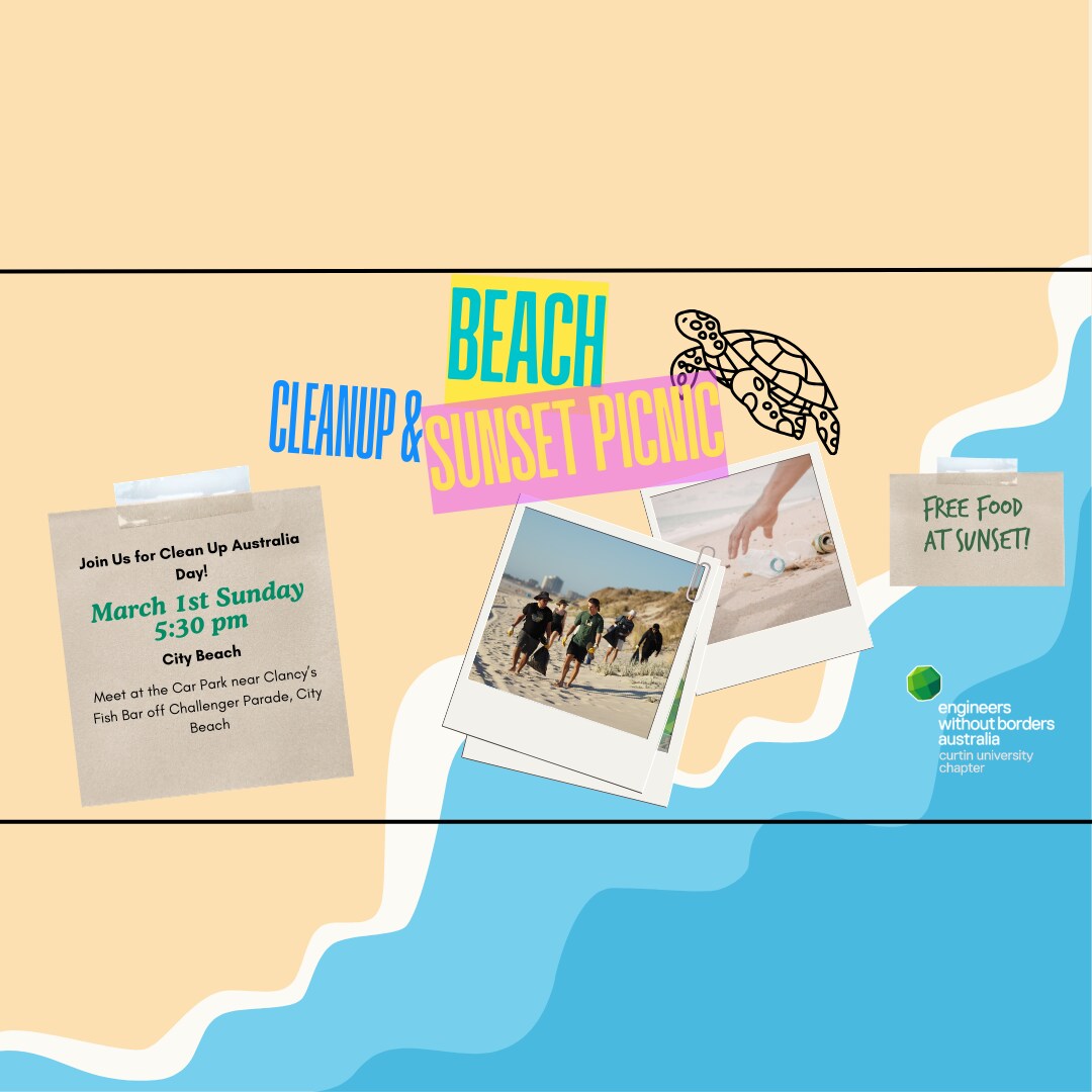 Come over to Curtin Engineers Without Bordersโ Beach Cleanup! As part of Clean Up Australia day, we invite you to help keep our Perth beaches beautiful and admire the sun-painted waves. Food and drinks will be provided in the form of a sunset picnic afterwards as a reward for your hard work!